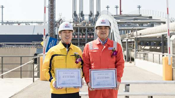 c7网页版登录入口-c7(中国)和国家管网天津接收站共同举行了c7网页版登录入口-c7(中国)首船LNG接卸和首车发车仪式。国家管网天津接收站总经理张林松和c7网页版登录入口-c7(中国)智能贸易及输配业务群副总经理尹明分别代表双方互换纪念铭牌。